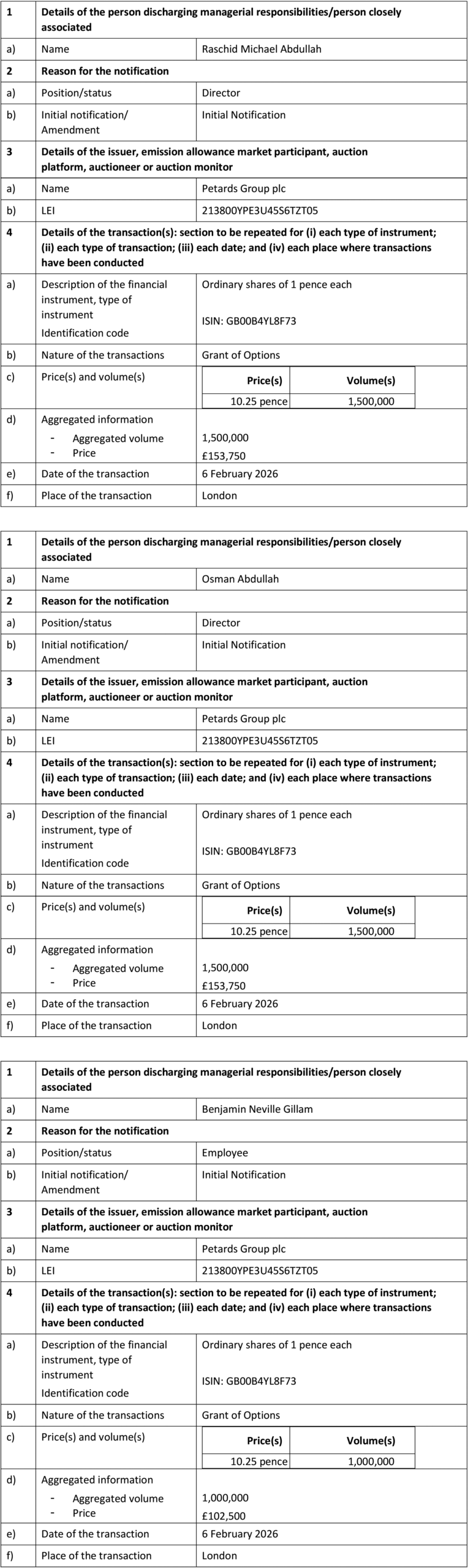 Immediately prior to this grant, Raschid Abdullah’s interest in the shares of Petards Group plc was 3,676,909 shares, representing 6.06% of the issued share capital (excluding those held in Treasury) and he held no options over its shares.